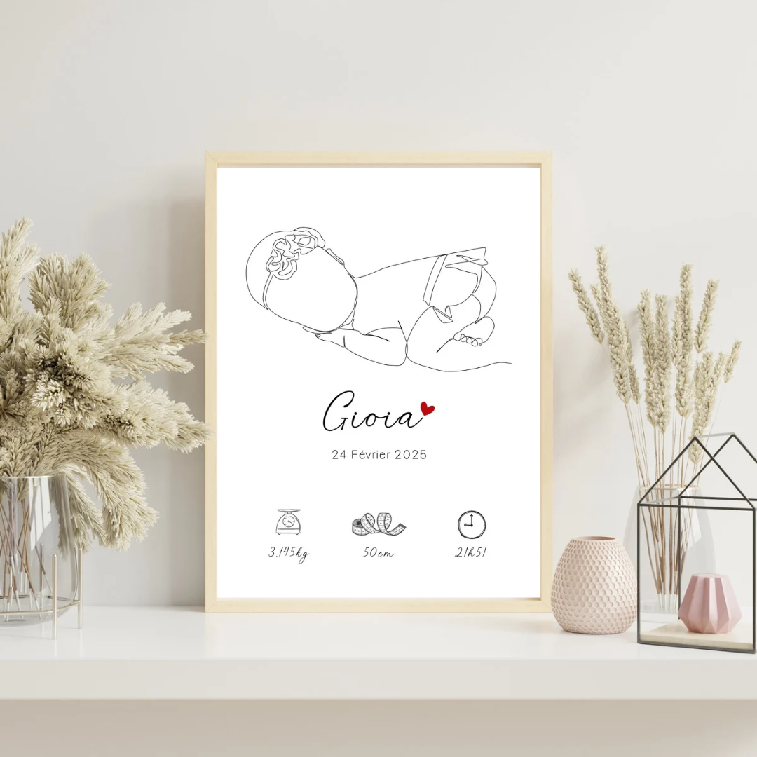 Immortalisez les premiers instants de vie de votre bébé avec une affiche de naissance digitale personnalisée. Parfaite pour décorer une chambre d’enfant ou offrir un cadeau unique et émouvant. Chaque affiche est créée avec soin, selon vos préférences, pour refléter l’histoire unique de votre enfant.