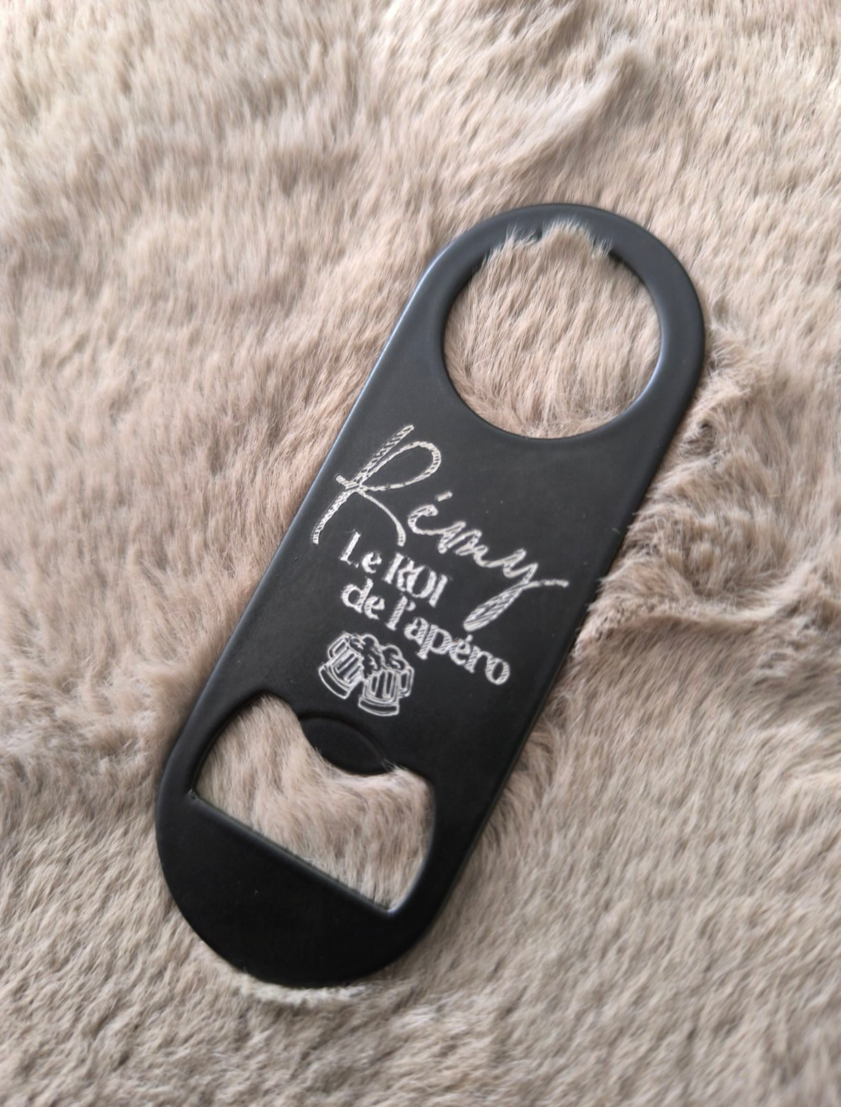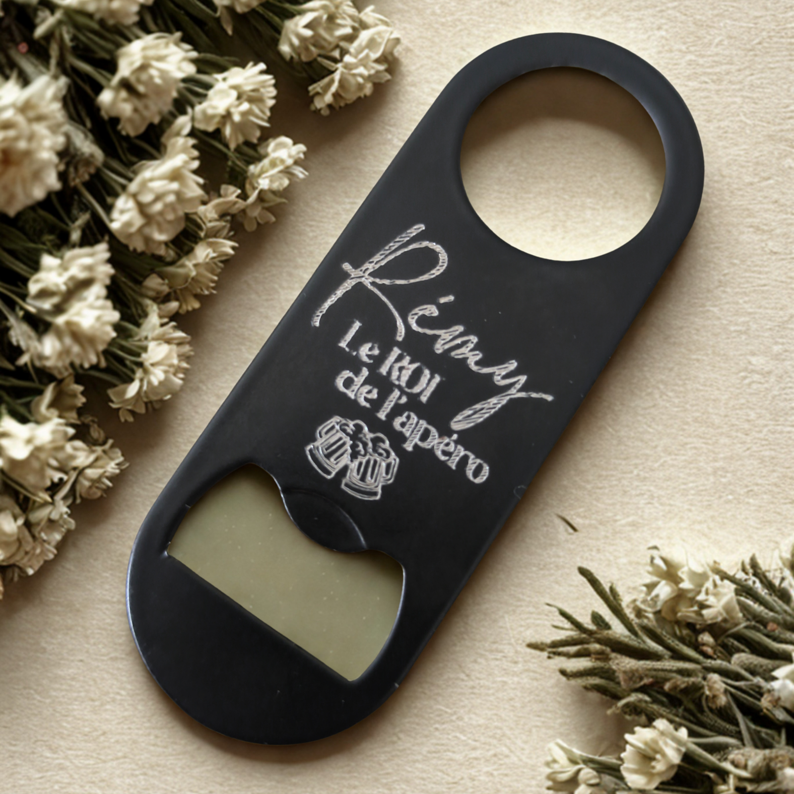 ✨ Décapsuleur personnalisé en acier inoxydable noir – Gravure effet hachure ✨