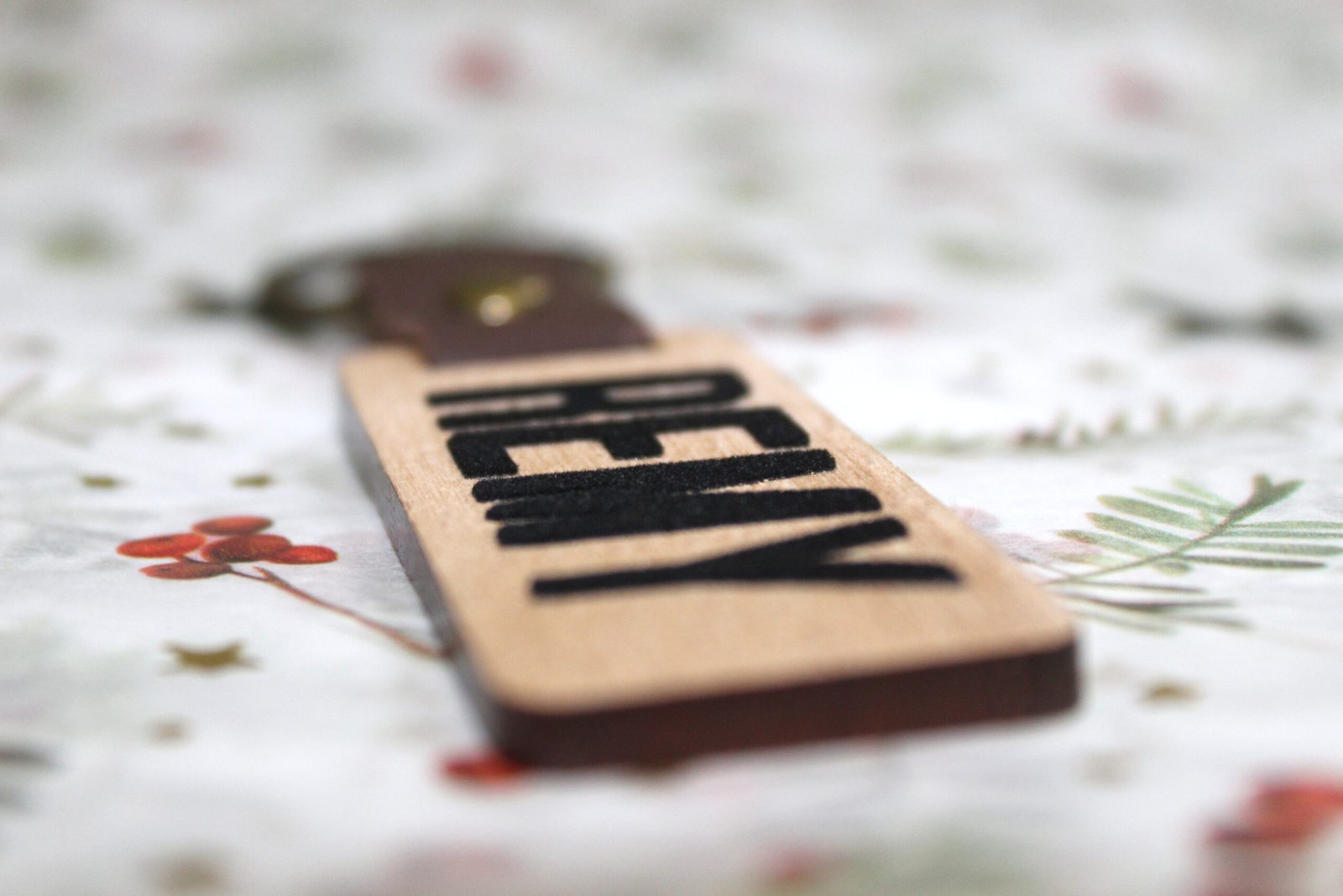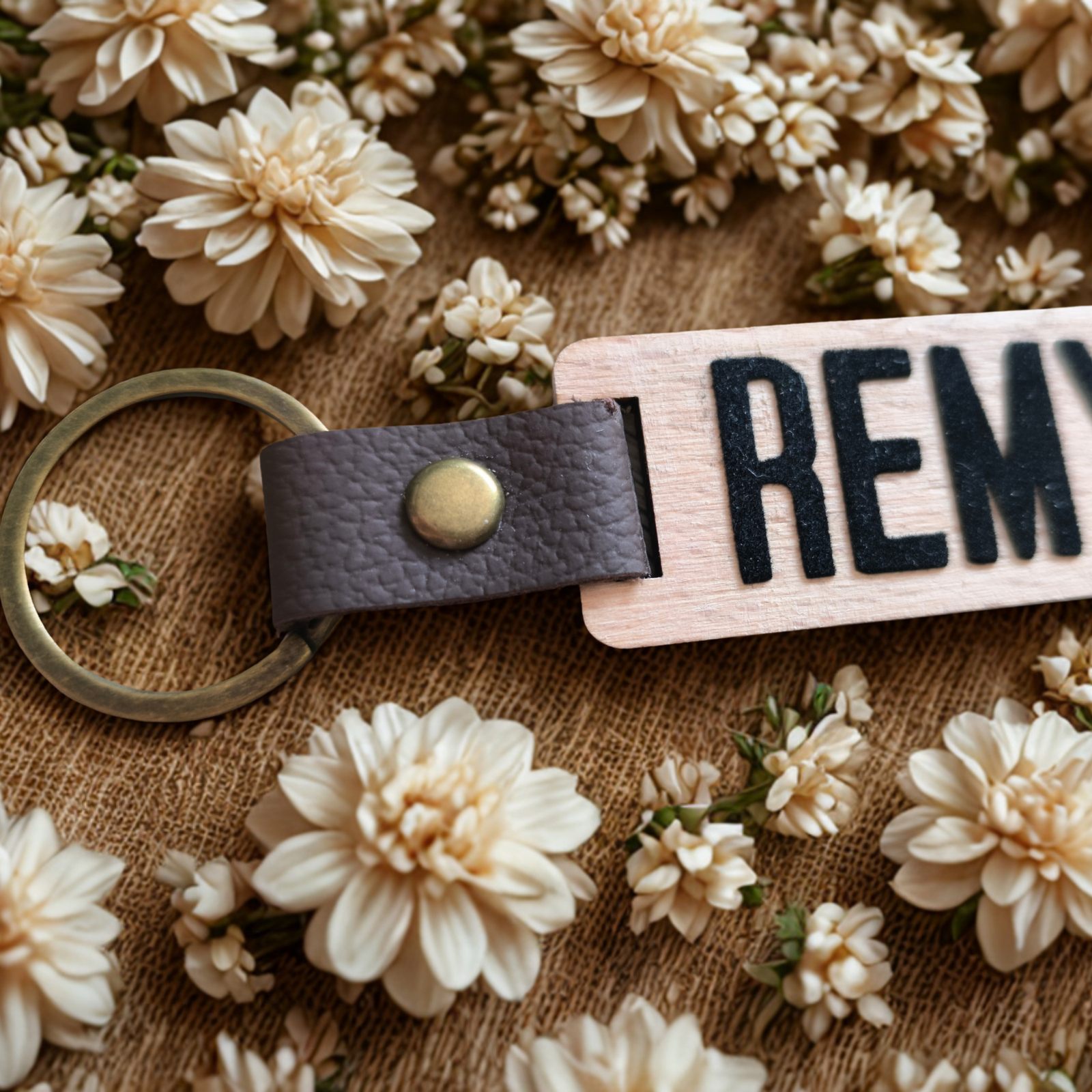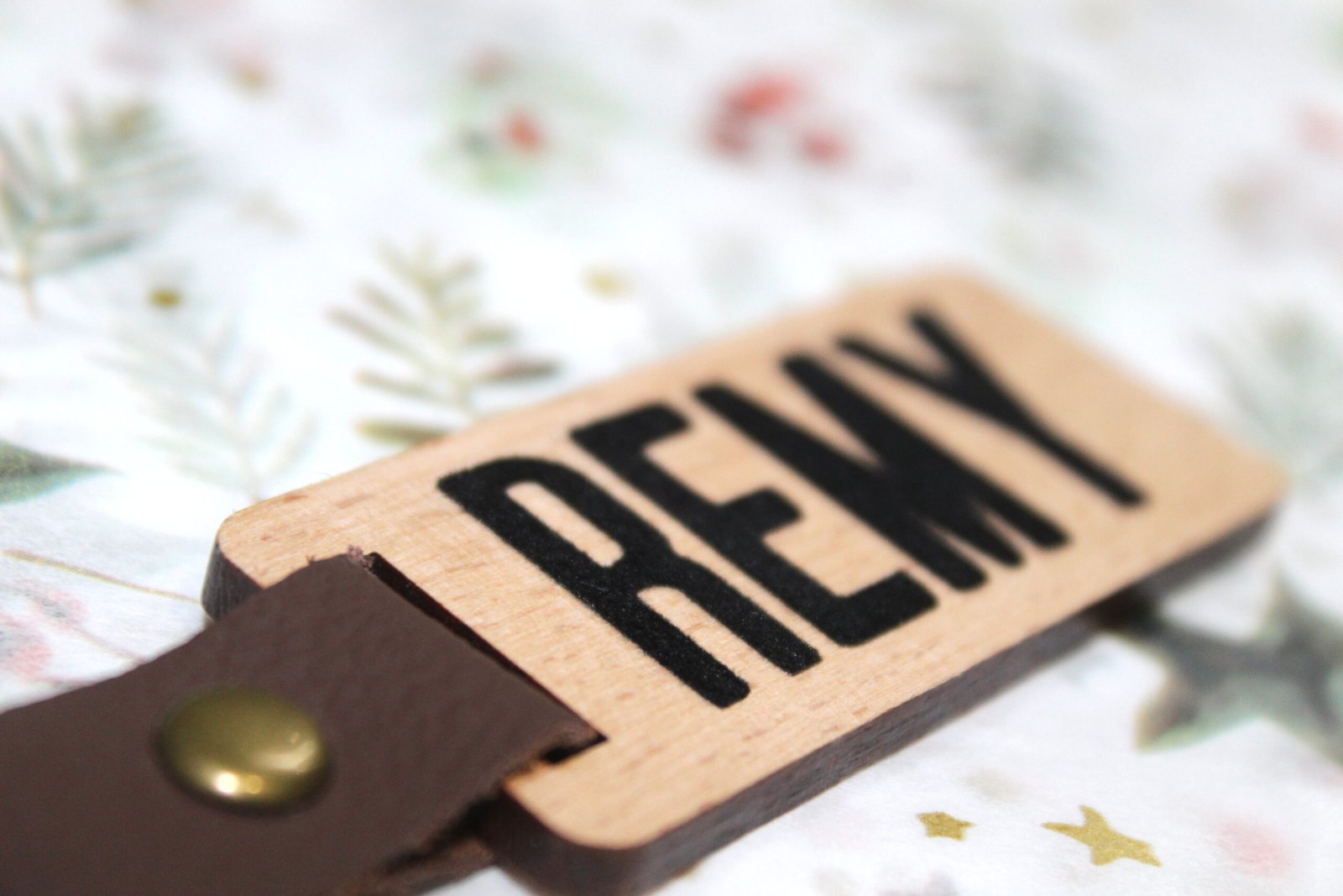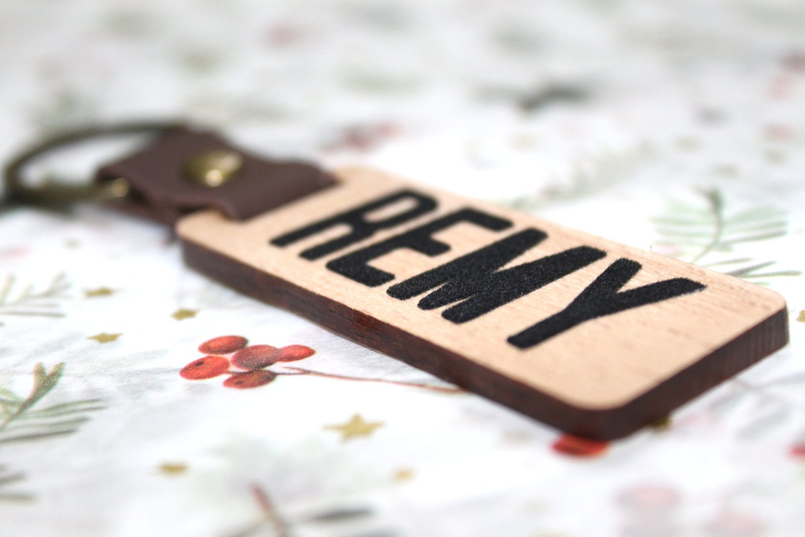 Ce porte-clé en bois naturel avec attache en cuir marron est personnalisé avec le prénom de votre choix, en finition velours douce.